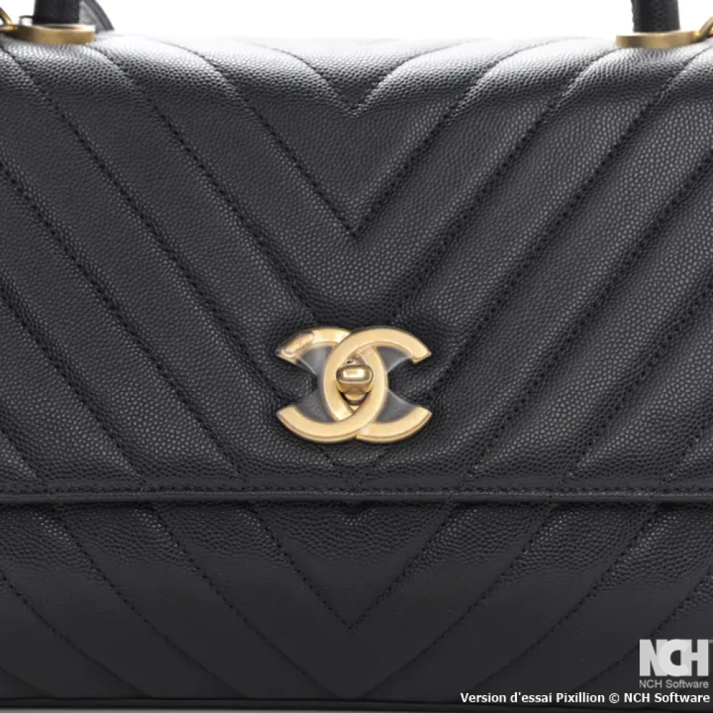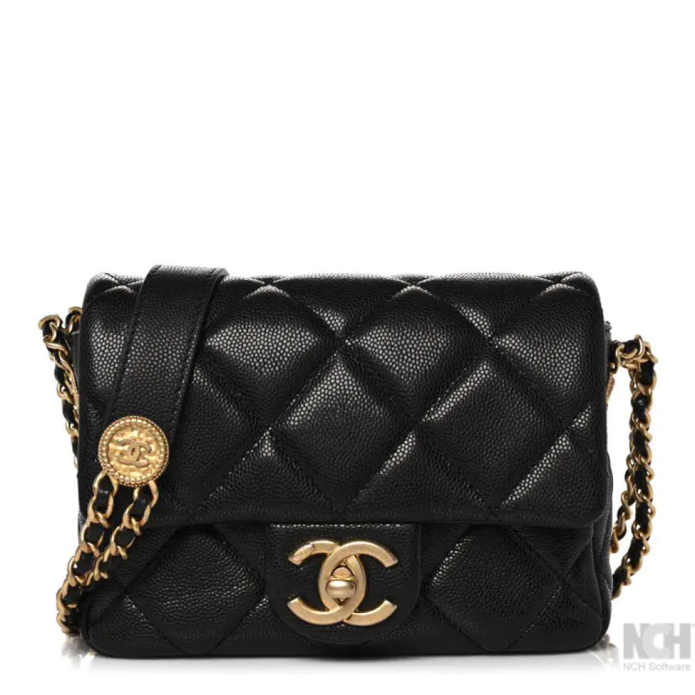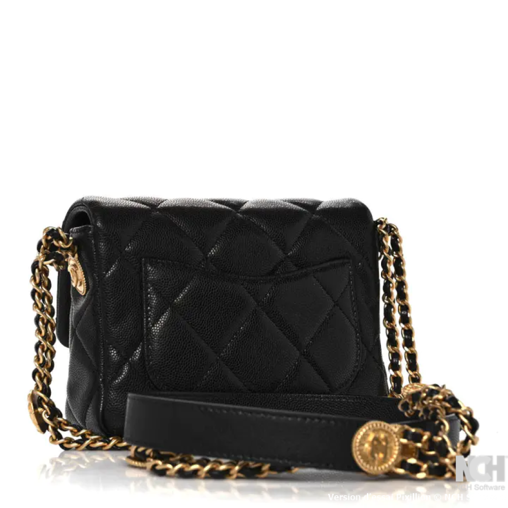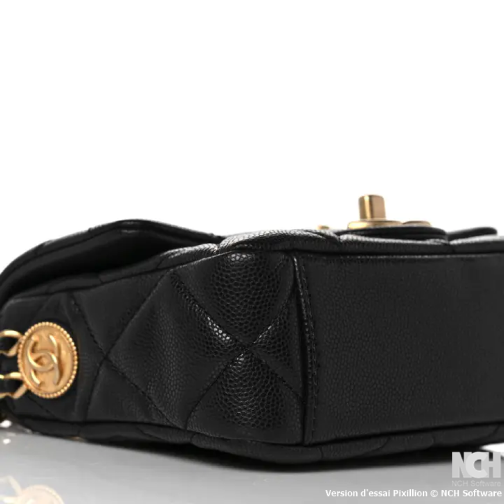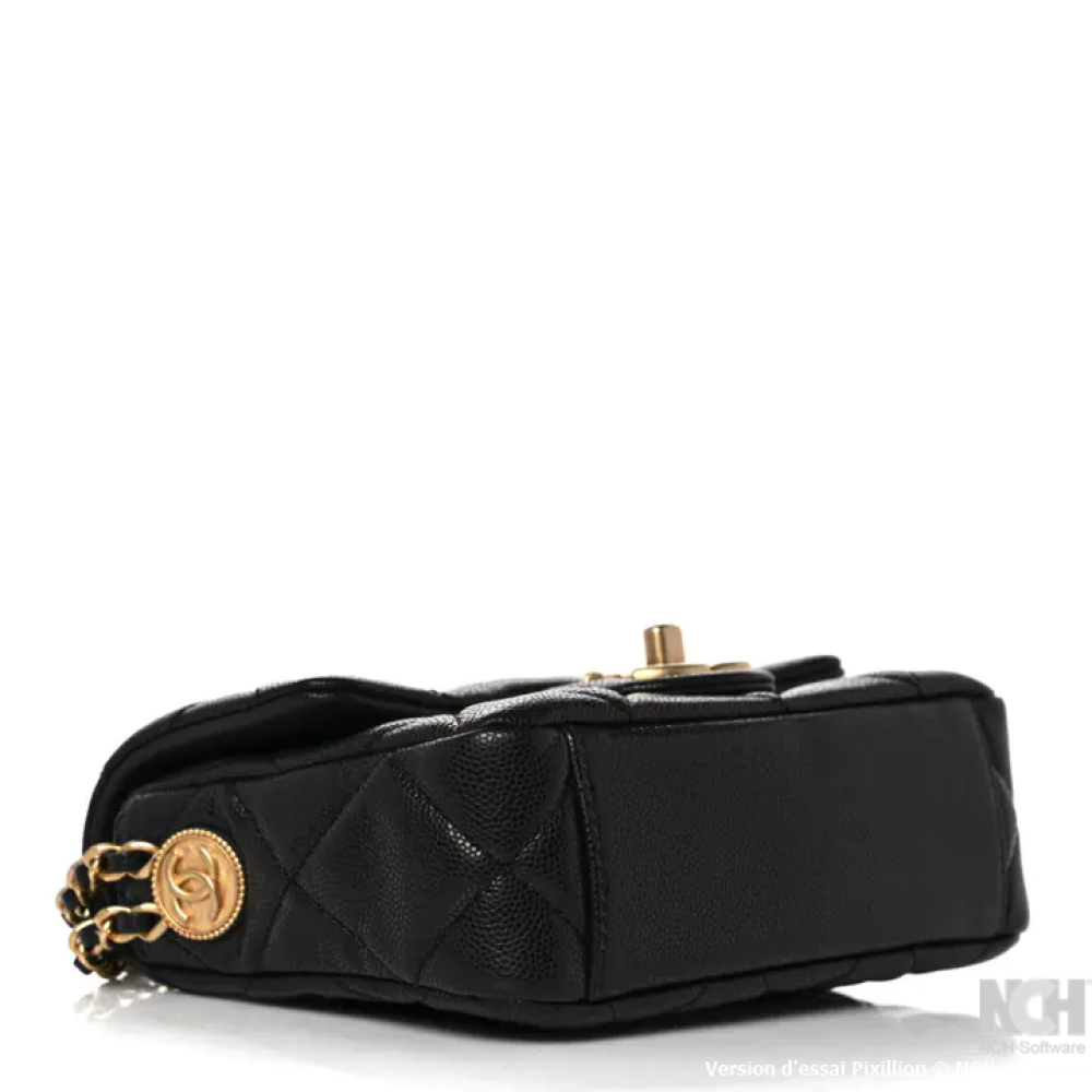 هذه حقيبة شانيل أصلية من جلد الكافيار المبطن، طراز ميني تويست يور بوتونز فلاب، باللون الأسود. صُنعت هذه الحقيبة الكتفية من جلد الكافيار الأسود المبطن على شكل ماسات. تتميز بحزام كتف من سلسلة ذهبية عتيقة اللون، وغطاء قلاب مزود بقفل دوار ذهبي اللون يحمل شعار CC. عند فتح الغطاء، يظهر تصميم داخلي مطابق مزود بجيب بسحاب.