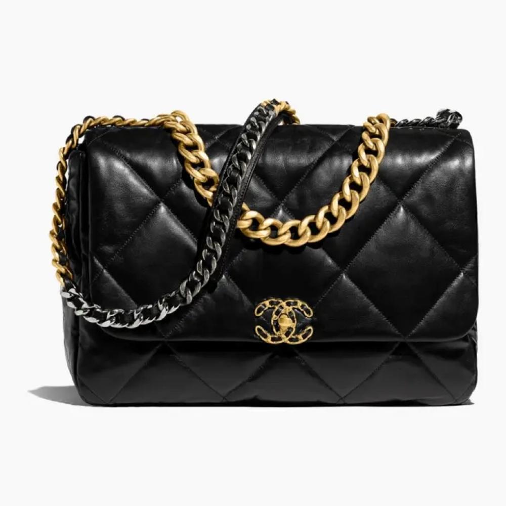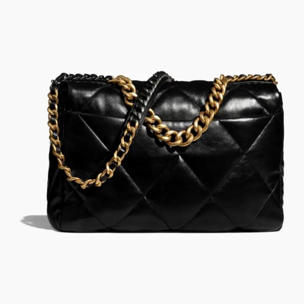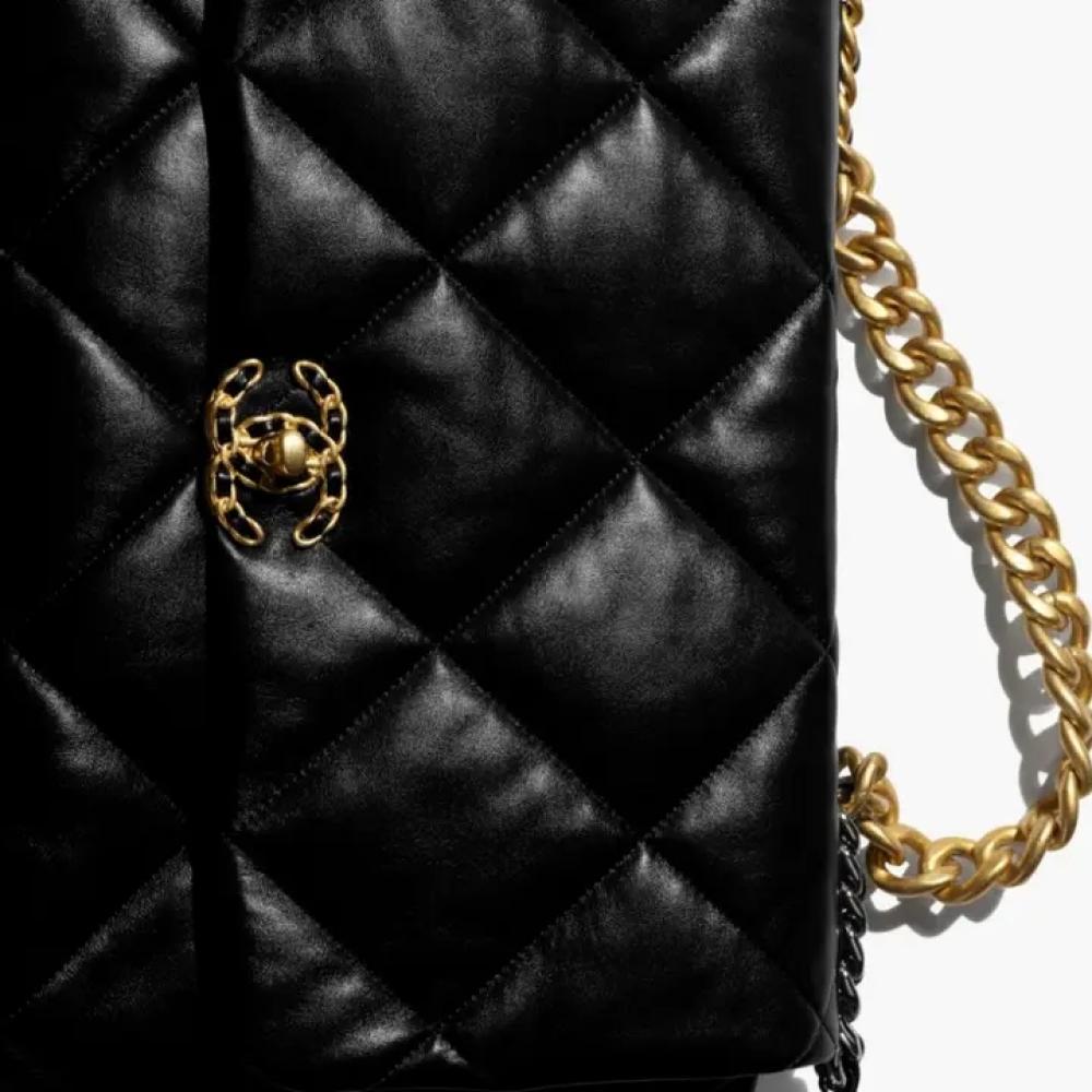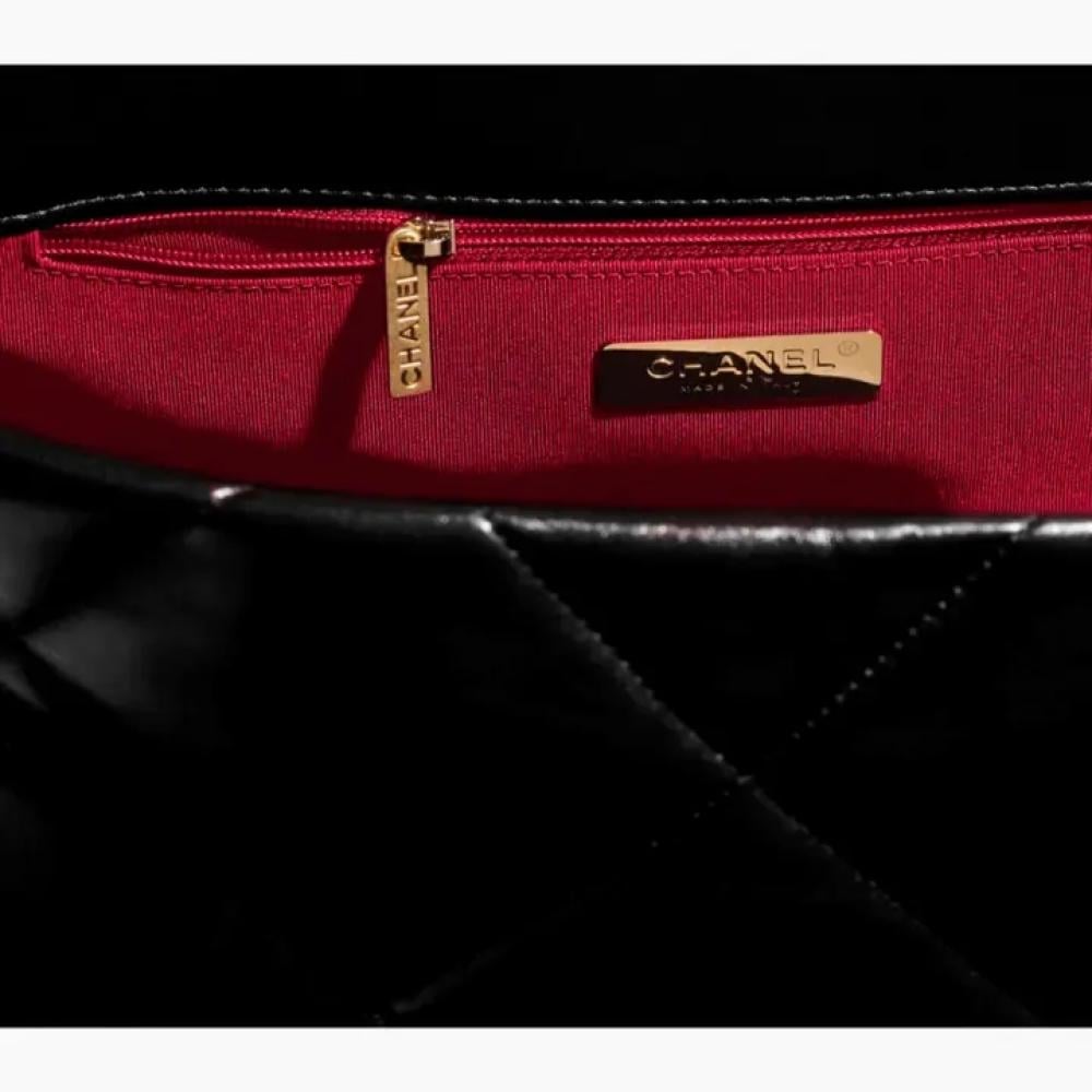 هذه حقيبة شانيل ماكسي 19 الأصلية من جلد الخروف الأسود المبطن. تتميز هذه الحقيبة الجريئة بتصميمها الأنيق المصنوع من جلد الخروف الأسود الناعم. تأتي بحزام كتف من الجلد الأسود المنسوج بسلسلة من الذهب والفضة والروثينيوم، ومقبض من سلسلة ذهبية عتيقة، وقفل دوار ذهبي اللون يحمل شعار شانيل CC على الغطاء الأمامي. تفتح الحقيبة لتكشف عن بطانة داخلية حمراء اللون مزودة بجيب بسحاب.