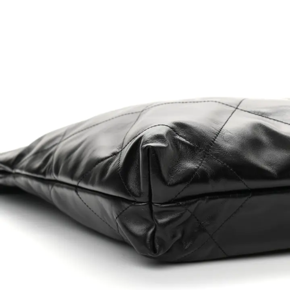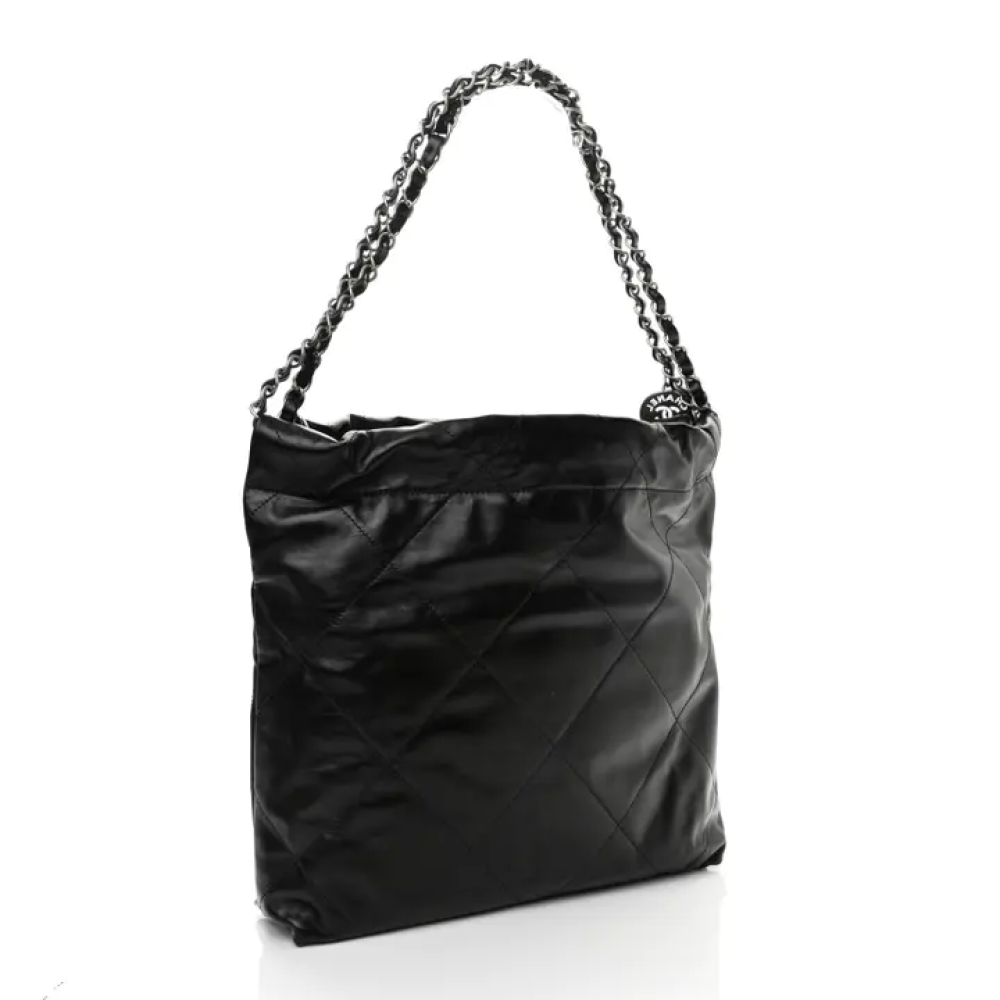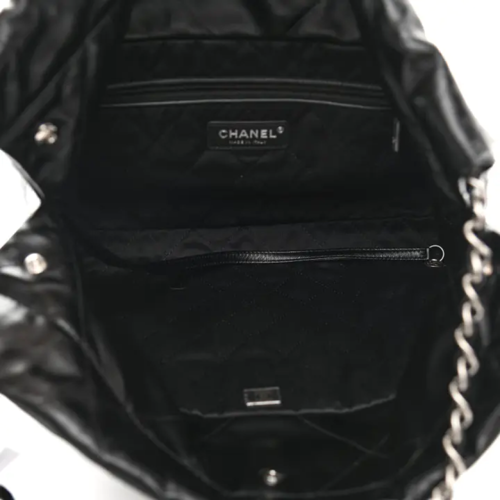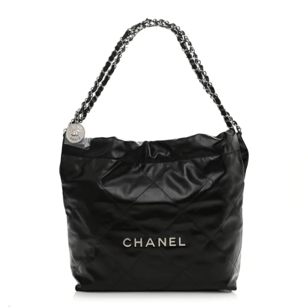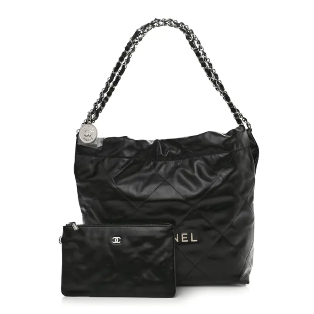 هذه حقيبة شانيل أصلية صغيرة الحجم، مصنوعة من جلد العجل اللامع المبطن، مقاس 22، باللون الأسود. تتميز هذه الحقيبة الأنيقة بتصميمها من جلد العجل الأسود المبطن بنمط ماسي. وتحتوي على حزام كتف من سلسلة الروثينيوم المنسوجة بالجلد، وشعار شانيل مطابق في الأمام. يُفتح الجزء العلوي بإغلاق مغناطيسي، ليكشف عن بطانة داخلية من القماش الأسود، مزودة بجيب وحقيبة صغيرة قابلة للإزالة.