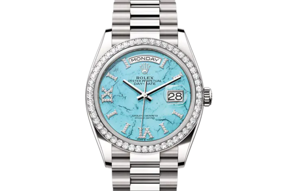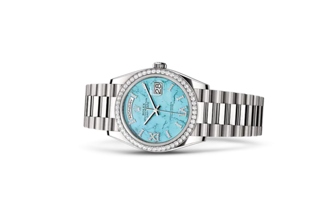 المرجع128349RBR، علبة الساعة:أويستر، 36 مم، ذهب أبيض مرصع بالألماس، الإطار:مرصع بالألماس، مقاومة الماء:مقاومة للماء حتى عمق 100 متر / 330 قدم،الحركة:ح...