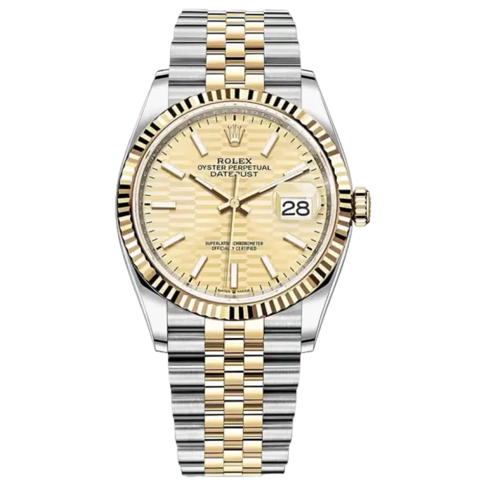 هذه نسخة رولكس ديت جست مقاس 36 مم بنقشة الشمبانيا. توقف إنتاج هذا المينا، مما زاد من شعبيتها. يُشكّل مينا الشمبانيا خلفية رائعة لهذه الساعة المصنوعة من الذهب عيار 18 قيراطًا والفولاذ المقاوم للصدأ. يُضفي سوار اليوبيل والإطار المخدد مزيدًا من الأناقة على هذه الساعة. بفضل حجمها البالغ 36 مم، تُعتبر هذه الساعة مناسبة للجنسين، لذا يُمكن ارتداؤها من قِبل الرجال والنساء على حدٍ سواء.