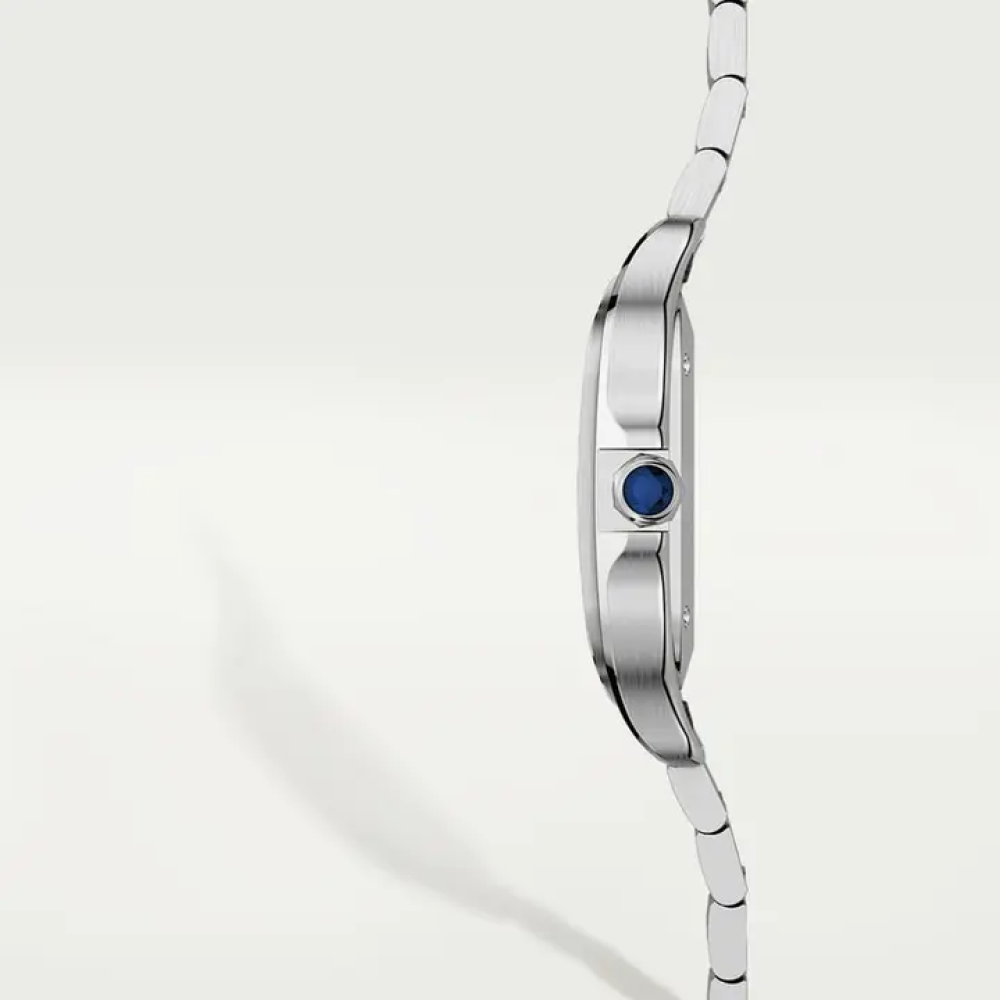 ساعة سانتوس، متوسطة الحجم، حركة ميكانيكية ذاتية التعبئة، عيار 1847 MC. علبة من الفولاذ، تاج سباعي الأضلاع مرصع بحجر سبينل صناعي مصقول، مينا فضي أوبالي...