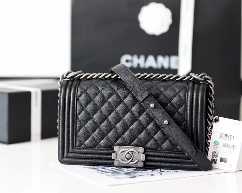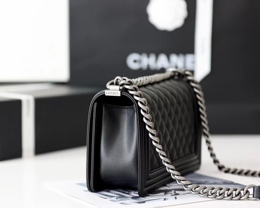 شنطة شانيل بوَي (Chanel Boy) بحجم 25 سم حجم متوسط تعتبر من أكثر التصاميم شهرة في مجموعة حقائب شانيل. يتميز هذا الموديل بتصميمه العصري والأنيق، مع إغلاق أمامي يزينه شعار شانيل المميز (CC) والمعدن المتين. تأتي الحقيبة عادةً مع سلسلة معدنية سميكة، يمكن استخدامها على شكل حقيبة كتف أو عبر الجسم، ما يجعلها مثالية للمناسبات الخاصة.