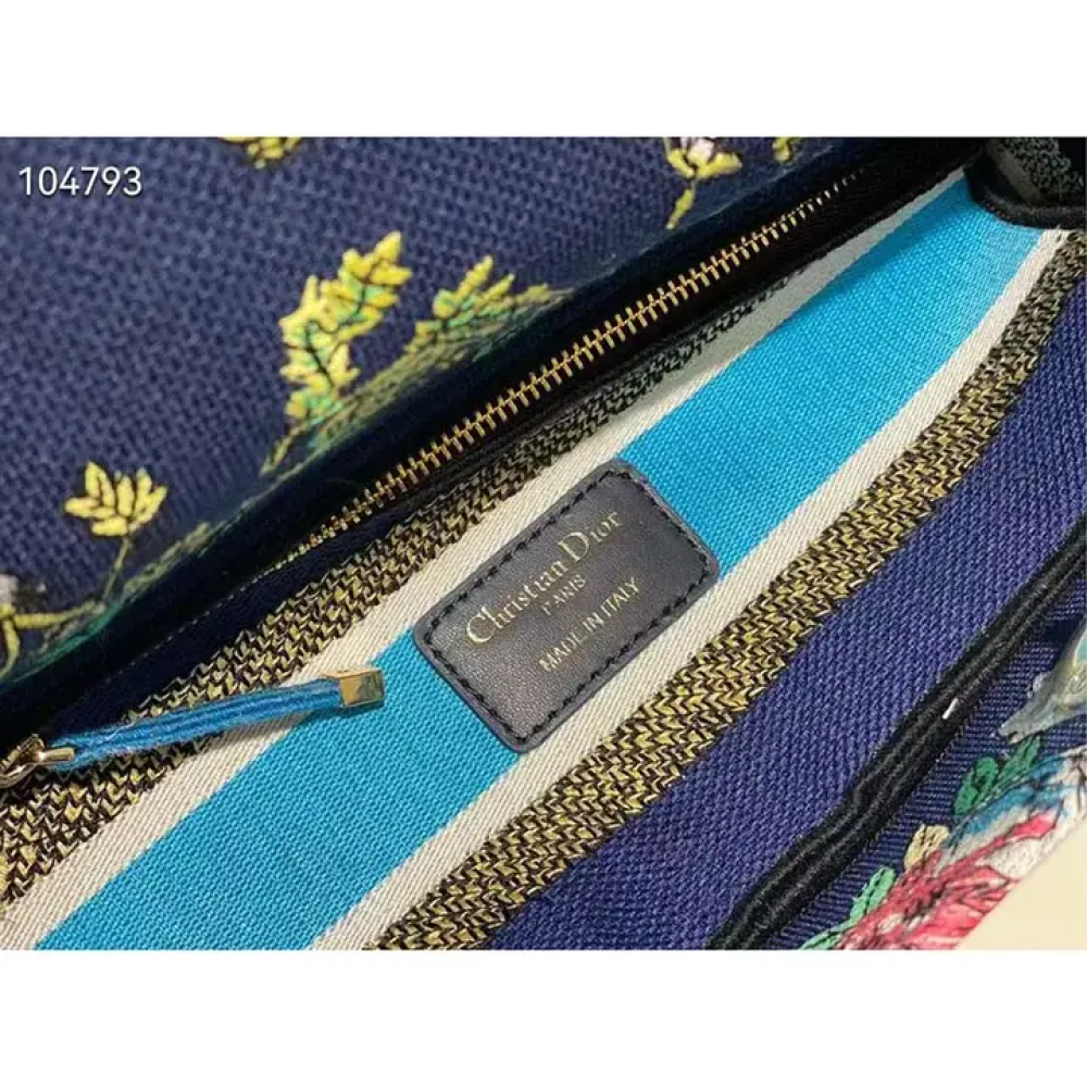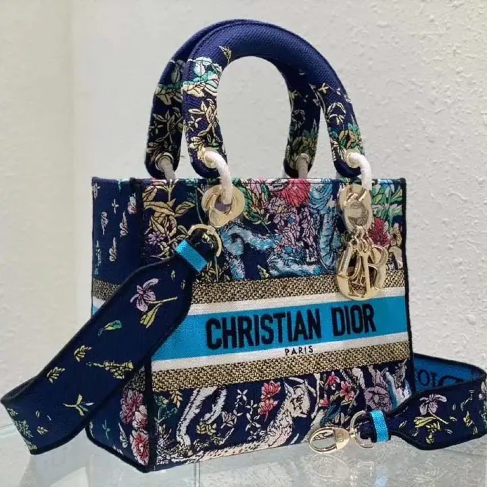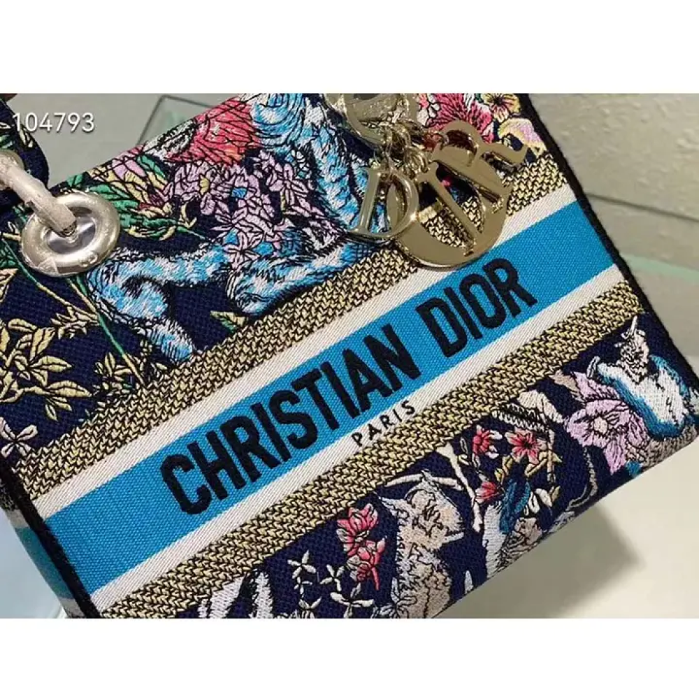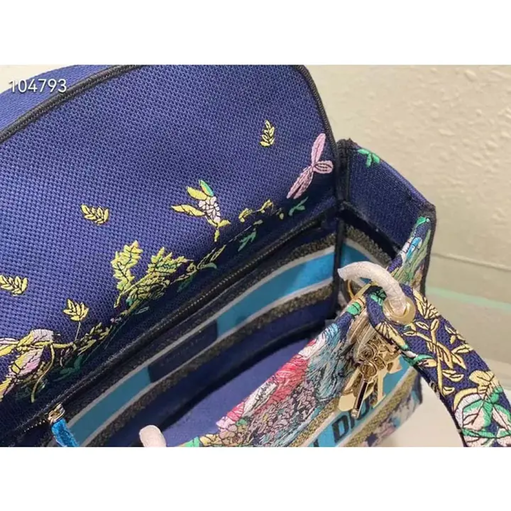 تجمع حقيبة ليدي دي-لايت بين الأناقة الكلاسيكية ولمسة دار ديور العصرية. تتميز الحقيبة بتطريز كامل بنقش كوكبة دي متعدد الألوان باللون الأزرق، وهو تصميم جديد مستوحى من شغف السيد ديور بعلم التنجيم.
