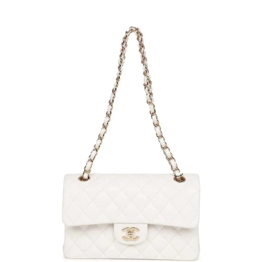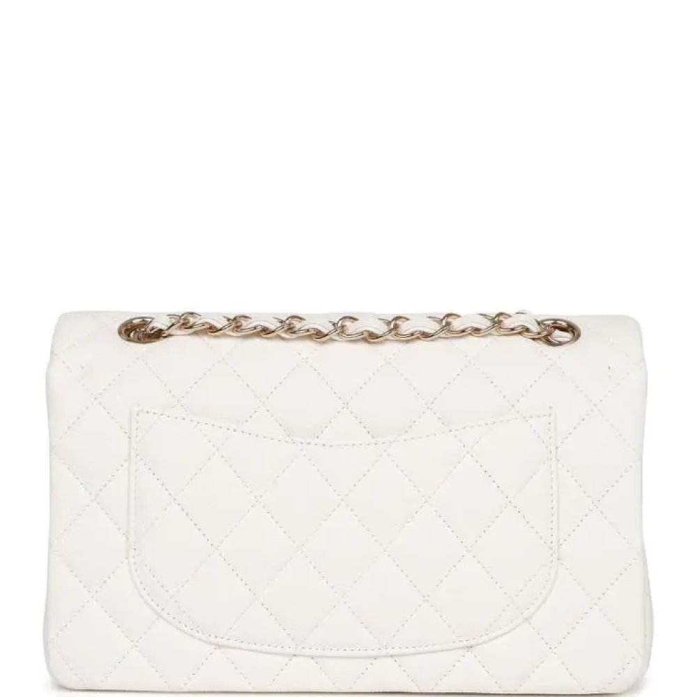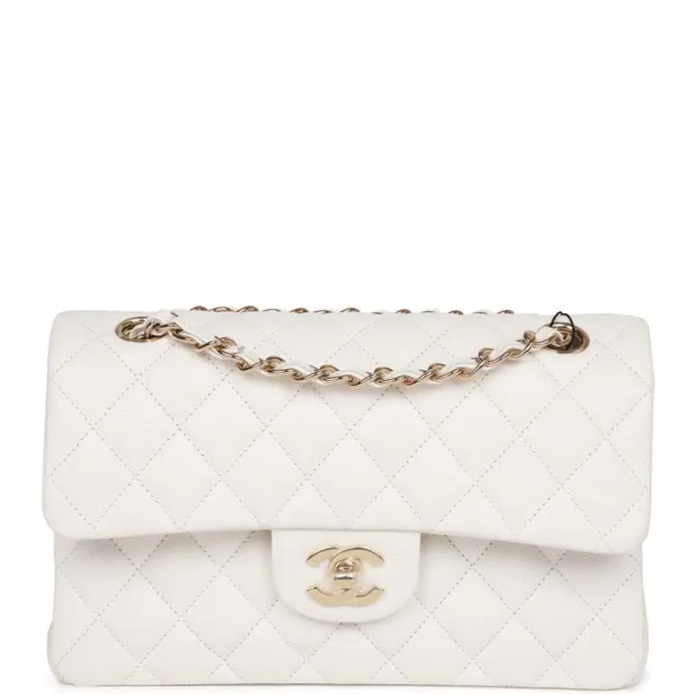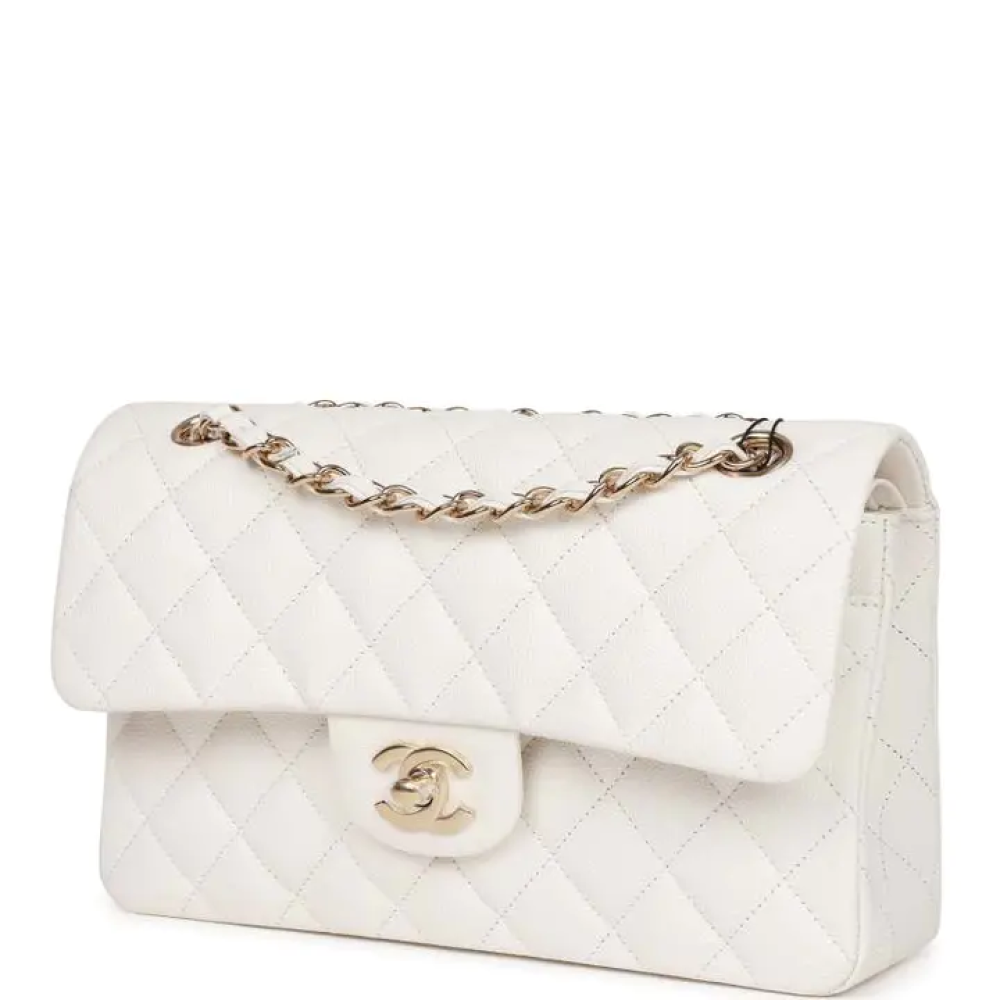 هذه الحقيبة الصغيرة الكلاسيكية ذات الغطاء المزدوج مصنوعة من جلد الكافيار الأبيض مع أجزاء معدنية ذهبية اللون فاتحة اللون، وتتميز بغطاء أمامي مزود بقفل ...