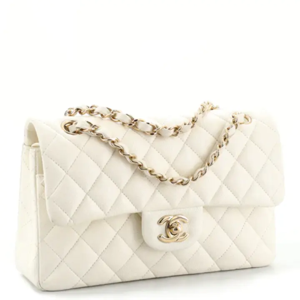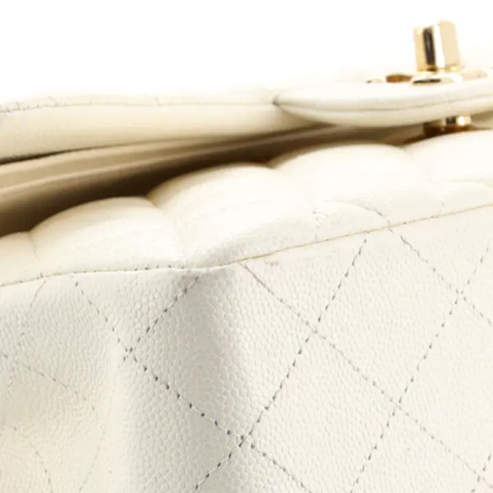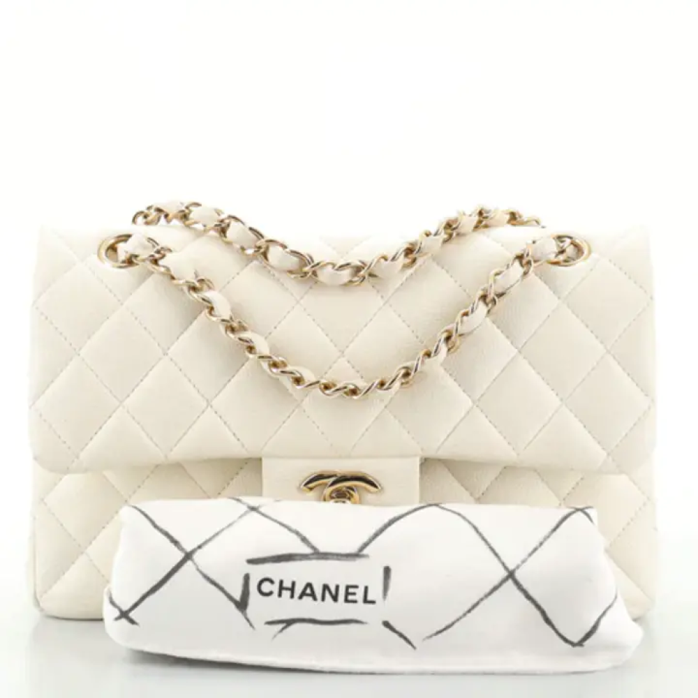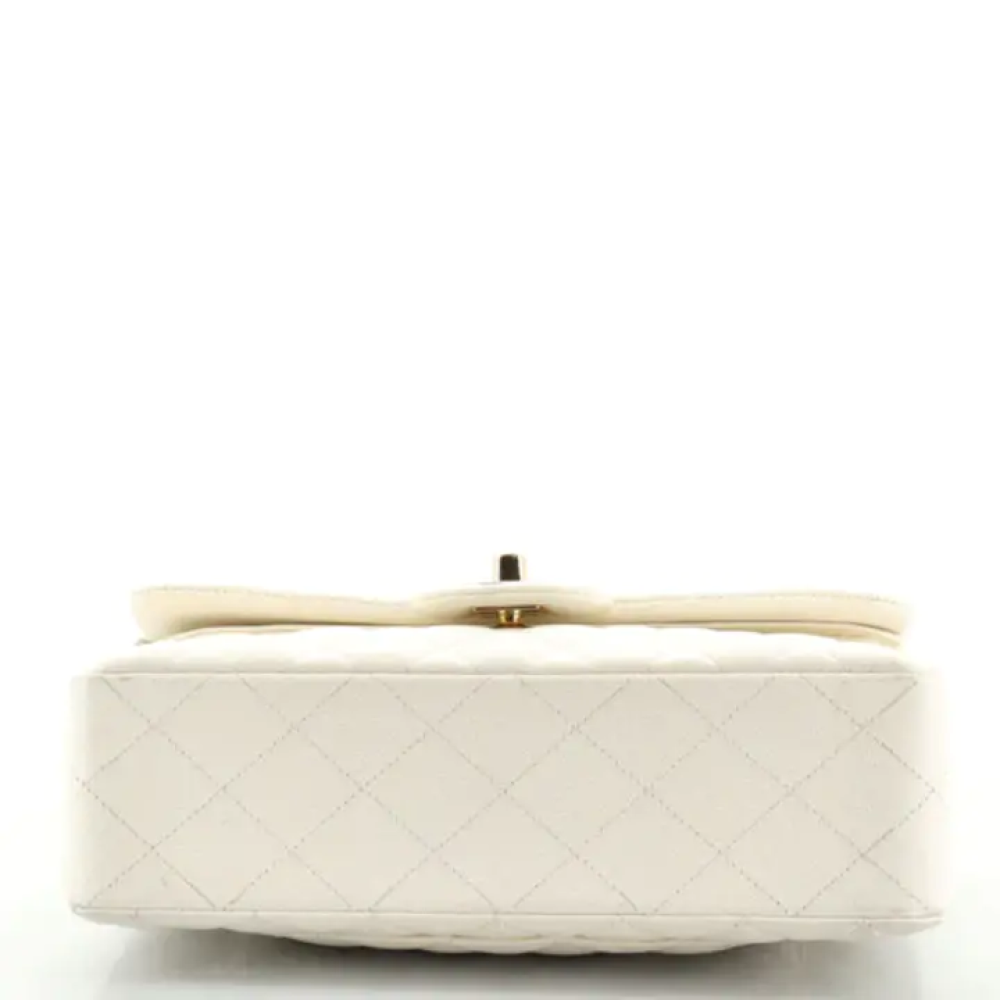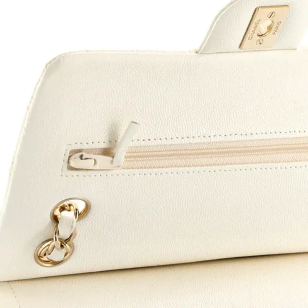 نادرة ورائعة! حقيبة شانيل متوسطة الحجم أصلية، ذات غطاء مزدوج، من القرن التاسع عشر، مصنوعة من جلد الكافيار المبطن العاجي، ومزينة بإكسسوارات ذهبية فاتحة. تتميز هذه الحقيبة الأنيقة بتصميمها الفاخر المصنوع من جلد الكافيار، وتزدان بإكسسوارات رائعة باللونين العاجي والذهبي الفاتح.
