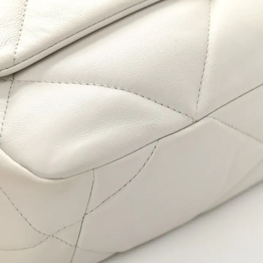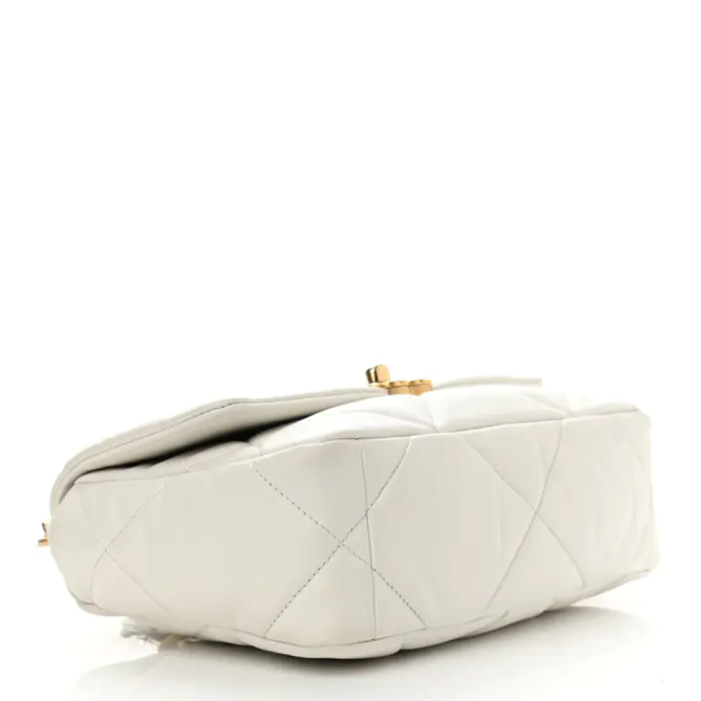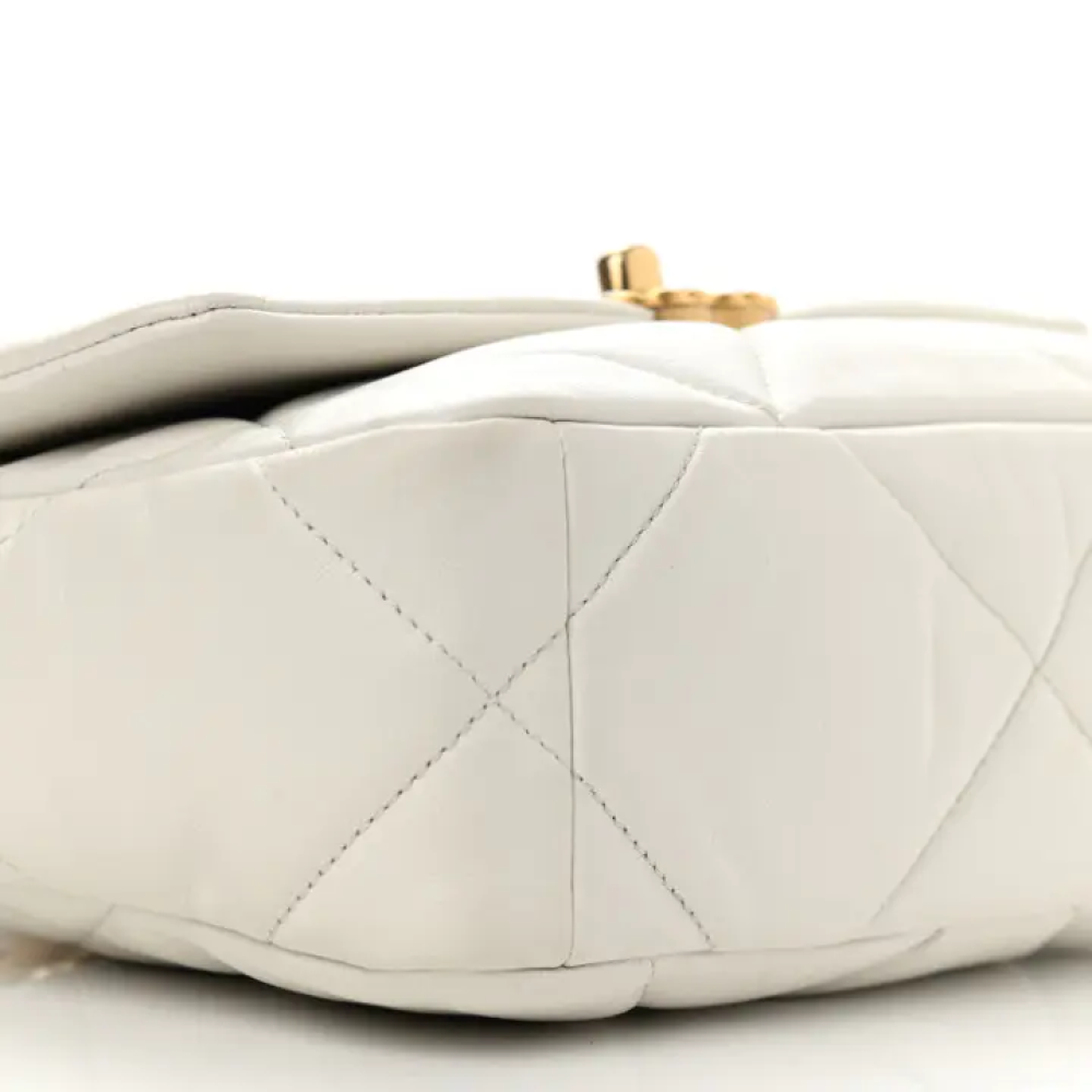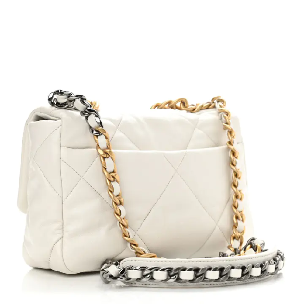 مقاس31*9*21cm يأتي معكيس غباربطاقة الأصالةوصفهذه حقيبة شانيل أصلية متوسطة الحجم من جلد الماعز المبطن، طراز 19، باللون الأبيض. تتميز هذه الحقيبة ا...