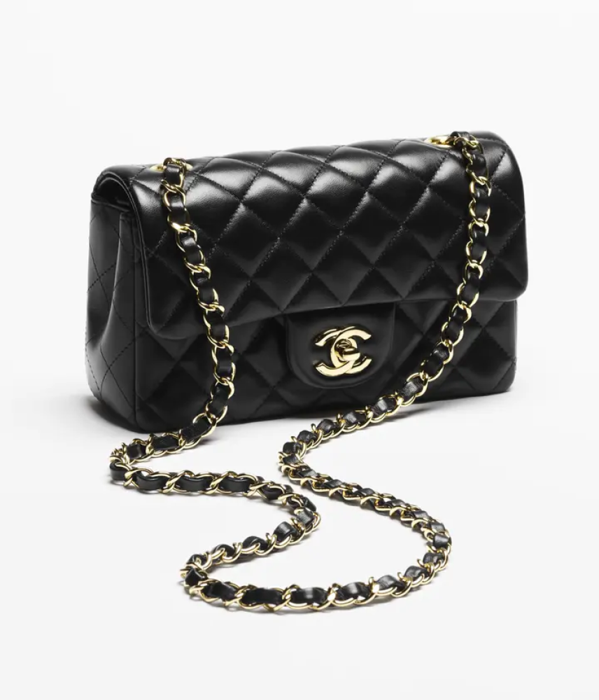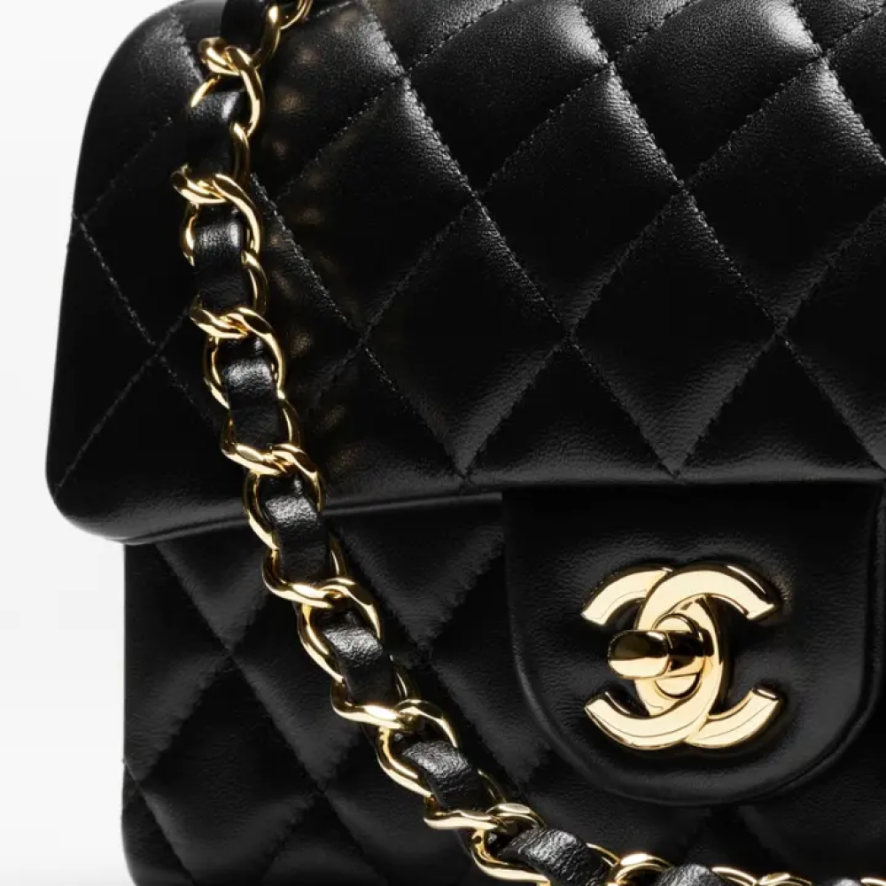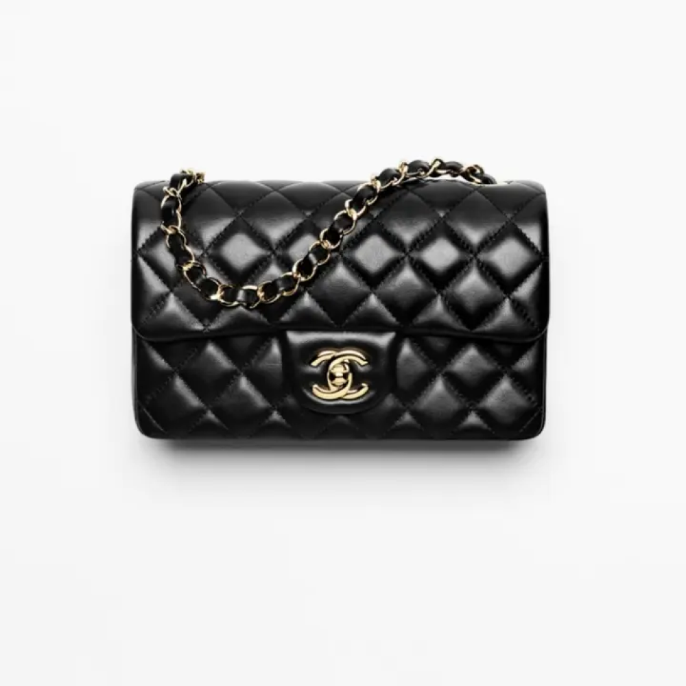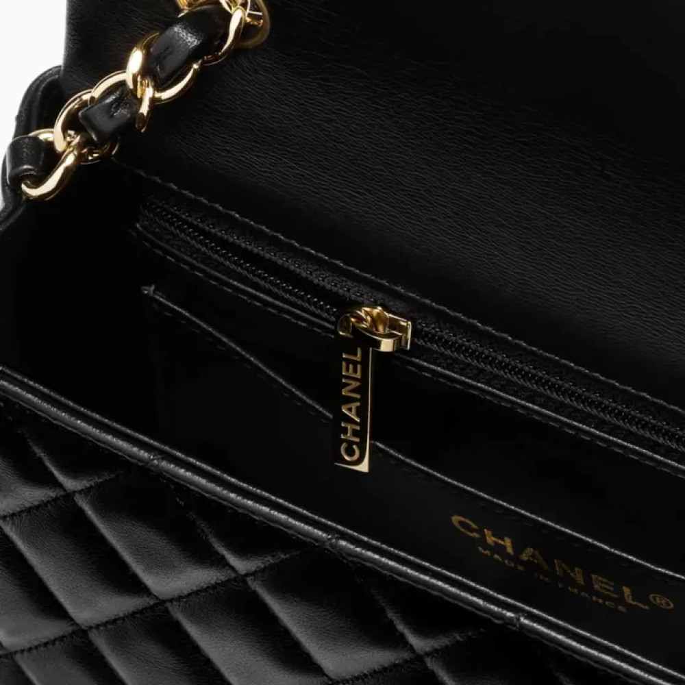 هذه حقيبة شانيل أصلية صغيرة مربعة الشكل من جلد الخروف الأسود المبطن. تتميز هذه الحقيبة الكلاسيكية بتصميمها الأنيق المصنوع من جلد الخروف الأسود الفاخر المبطن على شكل ماسات. تأتي الحقيبة مزودة بحزام كتف ذهبي فاتح اللون يصل إلى الخصر، وقفل شانيل CC ذهبي فاتح اللون. عند فتح الغطاء الأمامي، يظهر تصميم داخلي من الجلد الأسود مزود بجيب بسحاب وجيوب أخرى.
