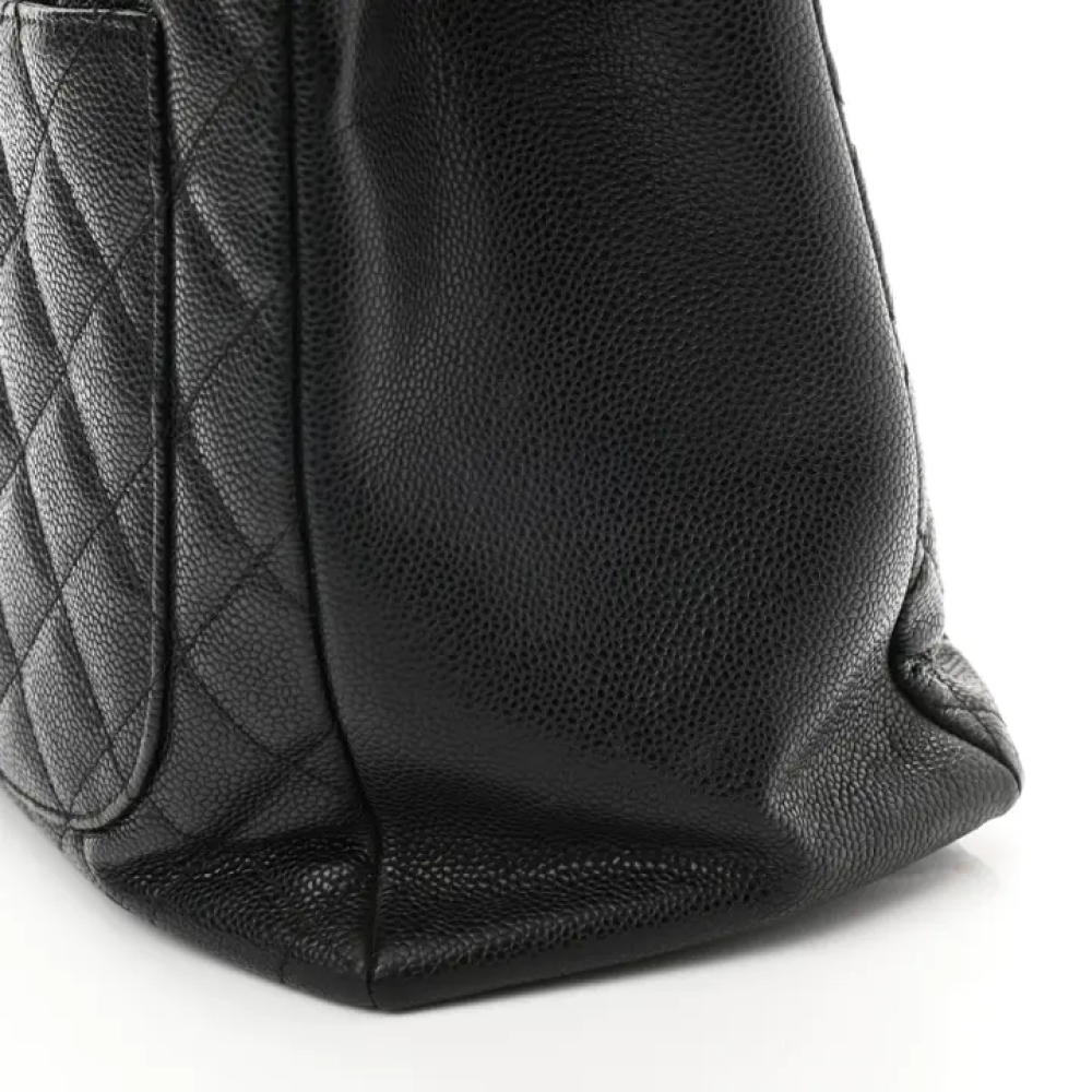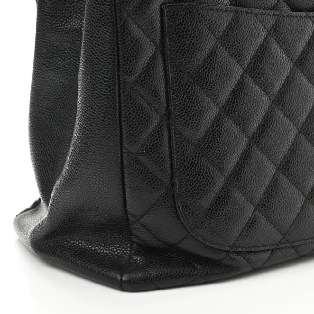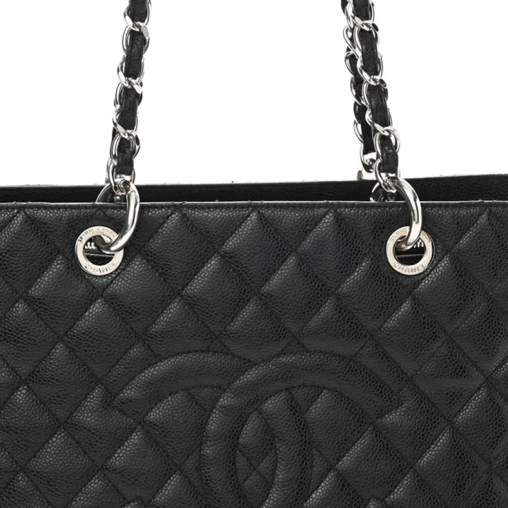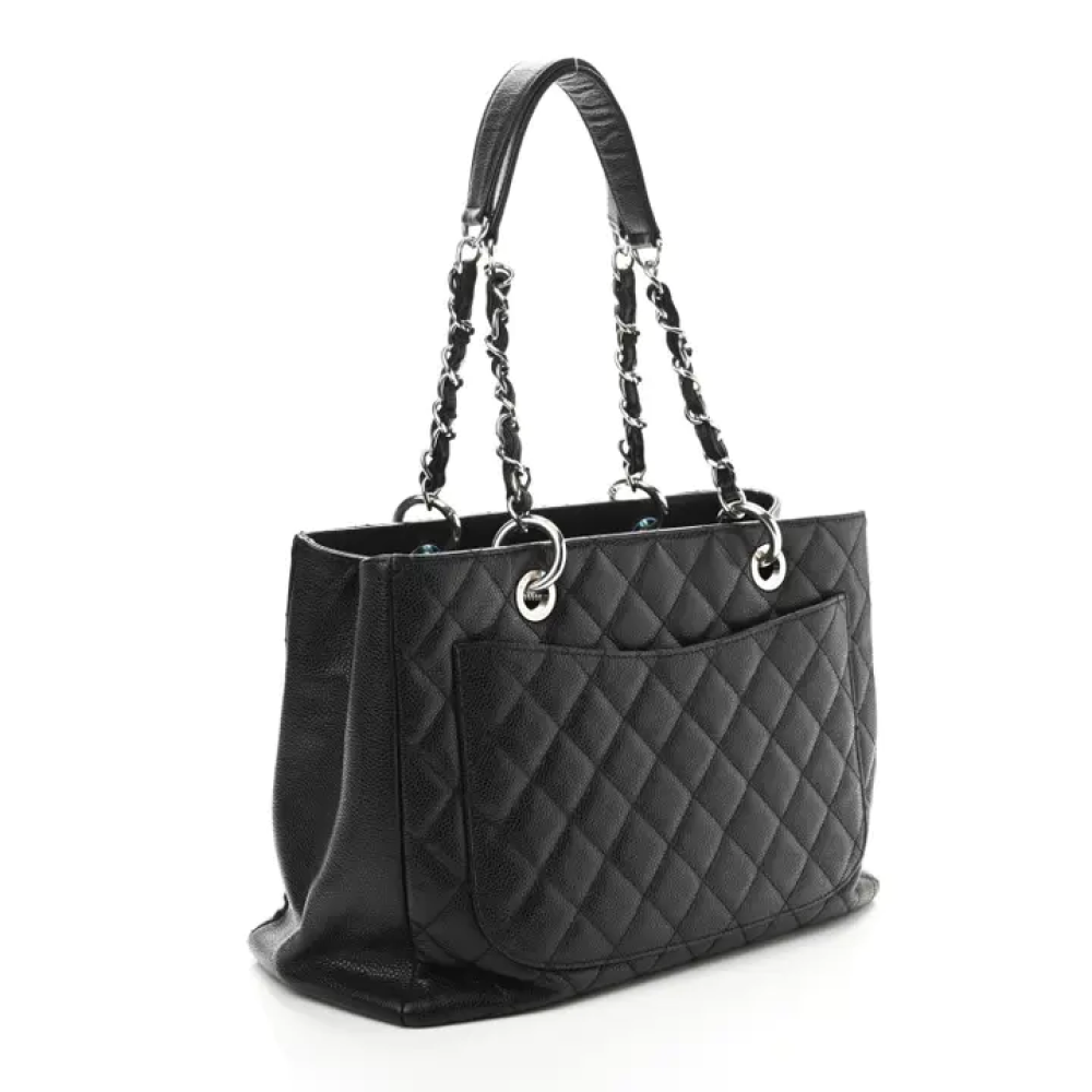 هذه حقيبة تسوق شانيل الأصلية الكبيرة GST من جلد الكافيار المبطن باللون الأسود. تتميز هذه الحقيبة الأنيقة بجلد الكافيار الأسود المبطن على شكل ماسي. وتحتوي على حزام كتف من سلسلة فضية مصقولة متشابكة مع الجلد، ووسادات كتف جلدية، وشعار شانيل CC مبطن بارز في الأمام، وجيب خلفي مسطح. يفتح الجزء العلوي ليكشف عن بطانة داخلية من الساتان الأسود مقسمة إلى أقسام، مع جيب مركزي بسحاب، وجيوب بسحاب وجيوب أخرى.