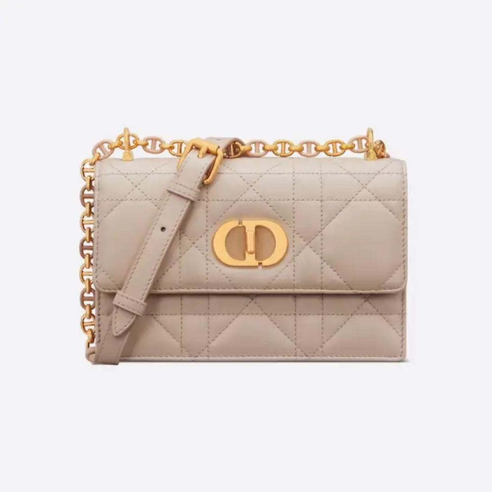 تُعدّ حقيبة Miss Caro الصغيرة ذات السلسلة إضافةً جديدةً إلى مجموعة خريف 2023 للأزياء الجاهزة، حيث تُثري مجموعة Dior Caro وتُجسّد أسلوبًا عصريًا وأنيقًا. صُنعت الحقيبة من جلد الغنم بلون الكراميل البيج، وتتميز بتطريز كاناج كبير الحجم لافت للنظر مع تأثير مُبطّن أنيق، بينما زُيّن غطاء الحقيبة بمشبك معدني ذهبي اللون على شكل قرص مضغوط، مُستوحى من إغلاق زجاجة عطر Christian Dior. تأتي الحقيبة مزودةً بحزام كتف قابل للتعديل، مصنوع بالتناوب من حلقات معدنية ذهبية اللون وحلقات مطلية بالمينا بنفس لون الجلد. يُمكن حملها باليد أو على الكتف باستخدام حزام جلدي لمزيد من الراحة.