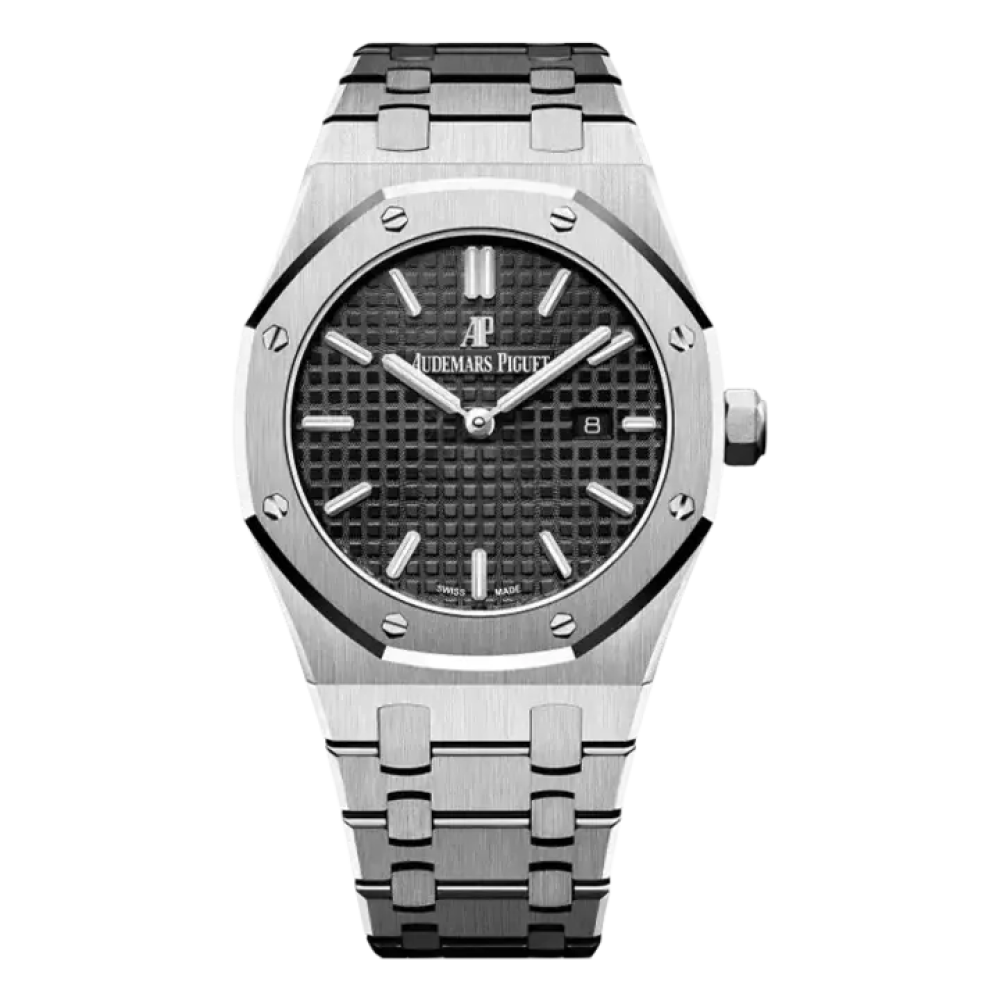 ساعة أوديمار بيغيه رويال أوك بميناء أسود قطره 33 مم. تتميز بعلبة وسوار من الفولاذ المقاوم للصدأ، وتعمل بحركة كوارتز. هذا يعني أن الساعة لا تحتاج إلى ت...