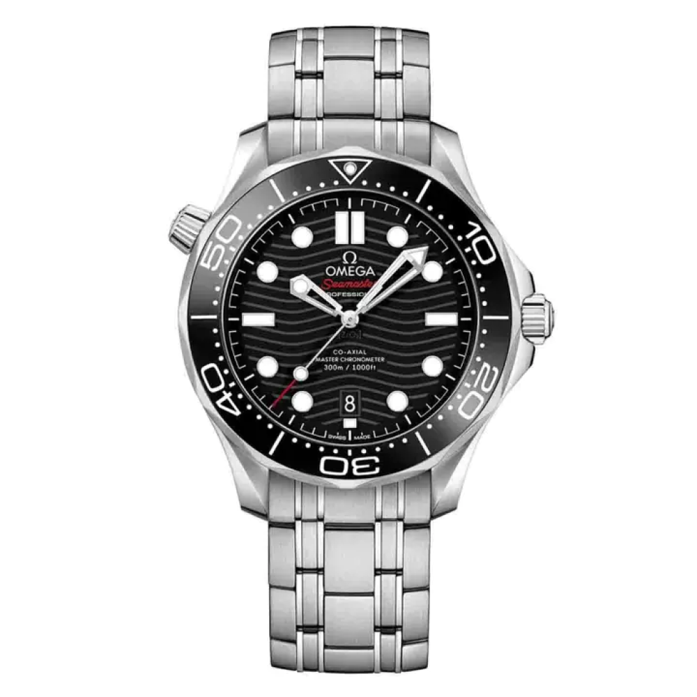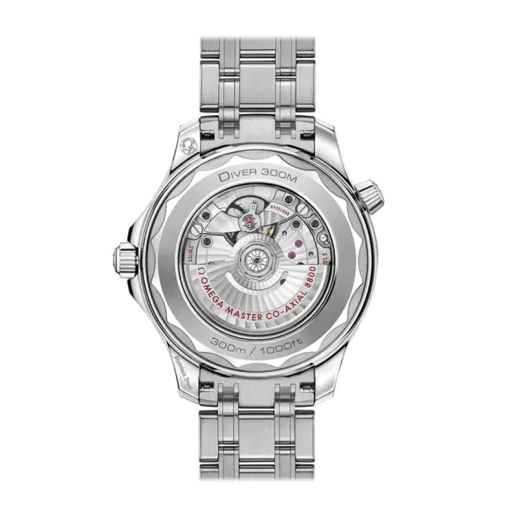 منذ عام 1993، حظيت ساعة Seamaster Professional Diver 300M بشعبية أسطورية. وقد استلهمت المجموعة العصرية اليوم من هذا الإرث البحري العريق، وطورته بأفضل ابتكارات وتصاميم أوميغا. صُنع هذا الموديل بقطر 42 مم من الفولاذ المقاوم للصدأ، ويتميز بإطار من السيراميك الأسود مع مقياس غوص مطلي بالمينا البيضاء. كما أن المينا مصنوع من السيراميك الأسود المصقول، ويتميز بنقوش أمواج محفورة بالليزر ونافذة لعرض التاريخ عند الساعة 6. أما العقارب الهيكلية والمؤشرات المرتفعة فهي مطلية بالروديوم ومملوءة بمادة SuperLumiNova البيضاء، بينما صُمم صمام تصريف الهيليوم بشكل مخروطي. تأتي الساعة بسوار من الفولاذ المقاوم للصدأ، وتعمل بحركة OMEGA Master Chronometer Calibre 8800، والتي يمكن رؤيتها من خلال الكريستال الياقوتي الموجود على الغطاء الخلفي ذي الحواف المتموجة.