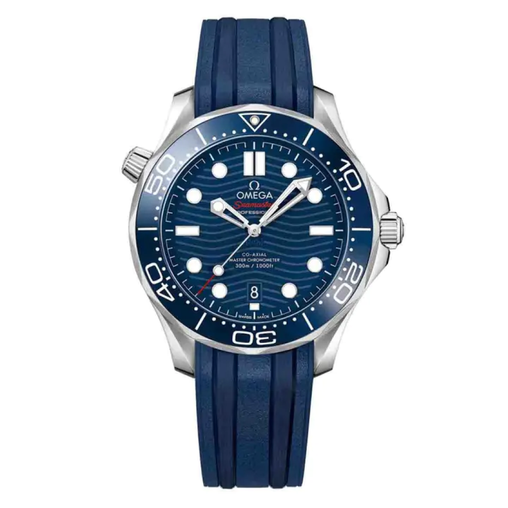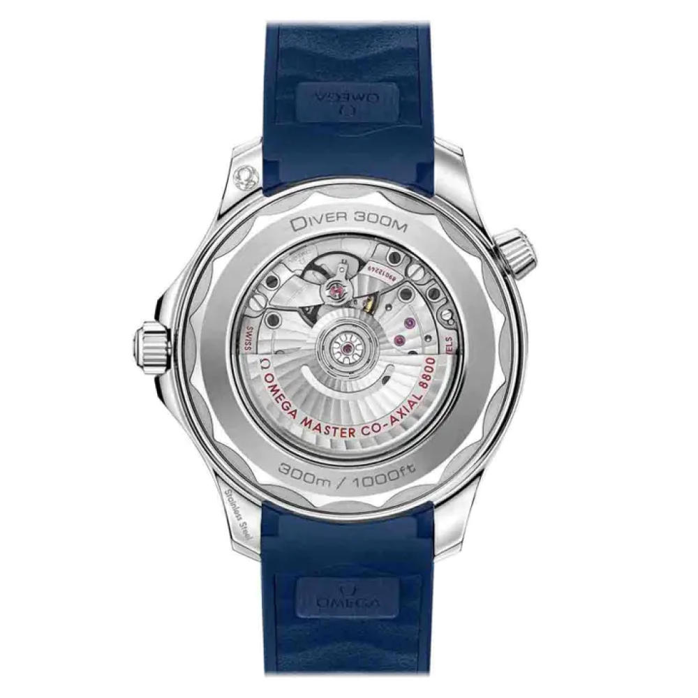 منذ عام 1993، حظيت ساعة Seamaster Professional Diver 300M بشعبية أسطورية. وقد استلهمت المجموعة العصرية اليوم من هذا الإرث البحري العريق، وطورته بأفضل ابتكارات وتصاميم أوميغا. صُنع هذا الموديل بقطر 42 مم من الفولاذ المقاوم للصدأ، ويتميز بإطار من السيراميك الأزرق مع مقياس غوص مطلي بالمينا البيضاء. كما أن المينا مصنوع من السيراميك الأزرق المصقول، ويتميز بنقوش أمواج محفورة بالليزر ونافذة لعرض التاريخ عند الساعة 6. أما العقارب الهيكلية والمؤشرات المرتفعة فهي مطلية بالروديوم ومملوءة بمادة SuperLumiNova البيضاء، بينما صُمم صمام تصريف الهيليوم بشكل مخروطي. تأتي الساعة بسوار مطاطي أزرق، وتعمل بحركة OMEGA Master Chronometer Calibre 8800 التي يمكن رؤيتها من خلال الكريستال الياقوتي الموجود على الغطاء الخلفي ذي الحواف المتموجة.