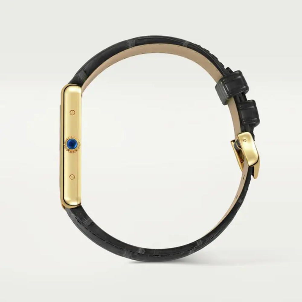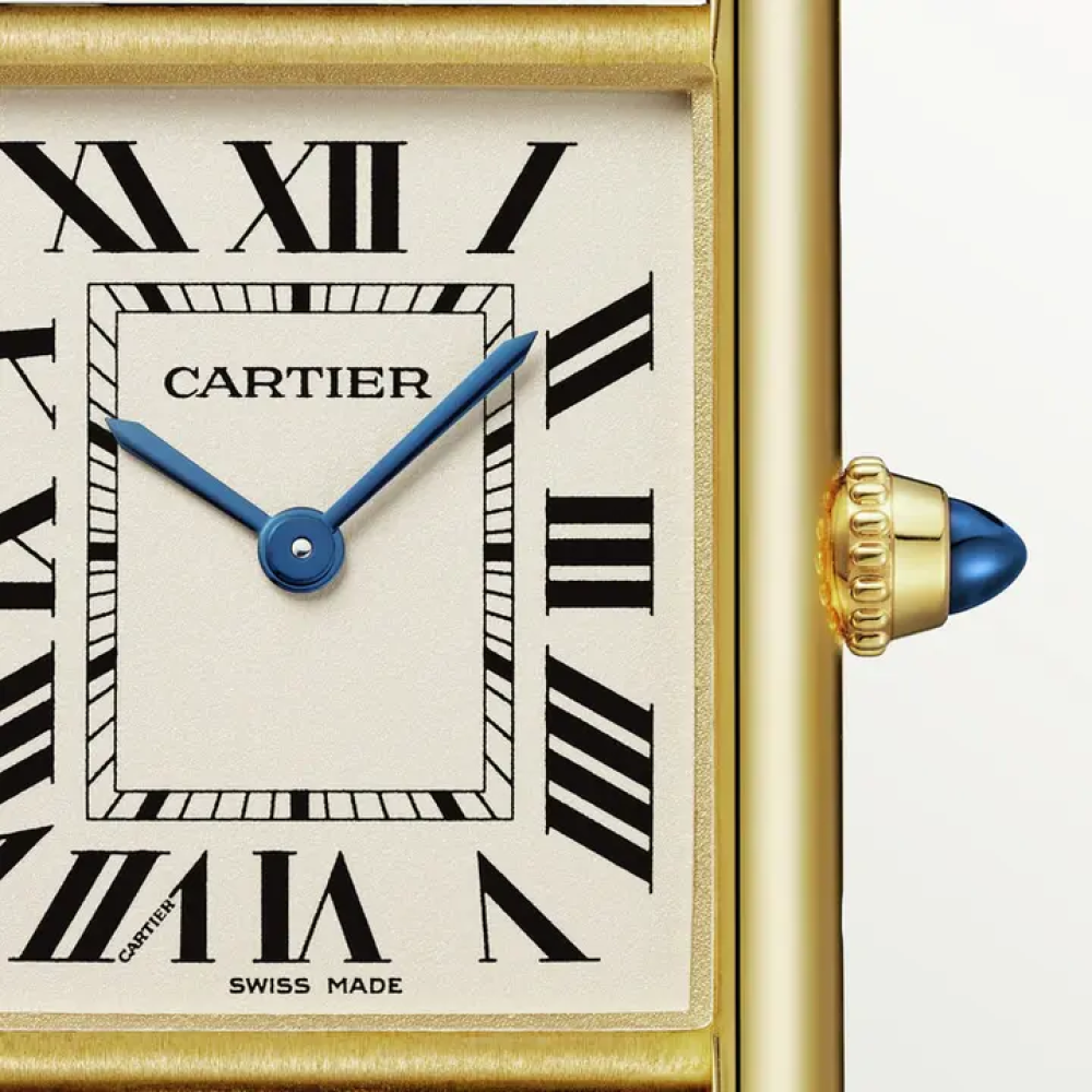 ساعة تانك من لويس كارتييه، موديل كبير، حركة كوارتز. علبة من الذهب الأصفر عيار 18 قيراطًا (750/1000)، تاج مزخرف مرصع بحجر ياقوت، مينا فضي محبب، عقارب ف...