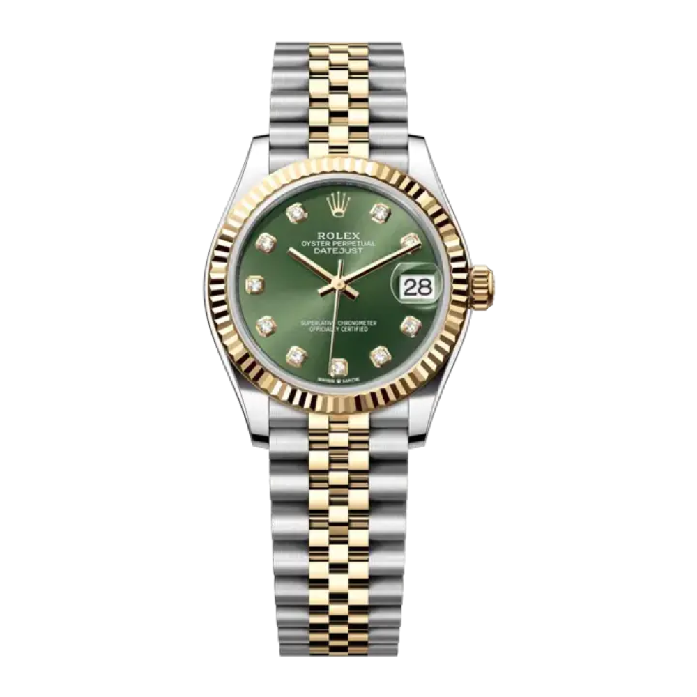 ساعة رولكس ديت جست مقاس 31 مم. تتميز بميناء أخضر جذاب مرصع بعلامات ساعات من الألماس. تتحرك عقاربها الأنيقة بانسيابية على الميناء، بينما تضمن نافذة التاريخ عند الساعة 3 سهولة الاستخدام والرقي. تتميز هذه الساعة بعلبة من الفولاذ المقاوم للصدأ وإطار مخدد من الذهب الأصفر. أما سوار جوبيلي ثنائي اللون اللافت للنظر، فهو مصنوع من الذهب الأصفر والفولاذ المقاوم للصدأ، مما يضفي توازناً مثالياً على مظهر الساعة وجاذبيتها.