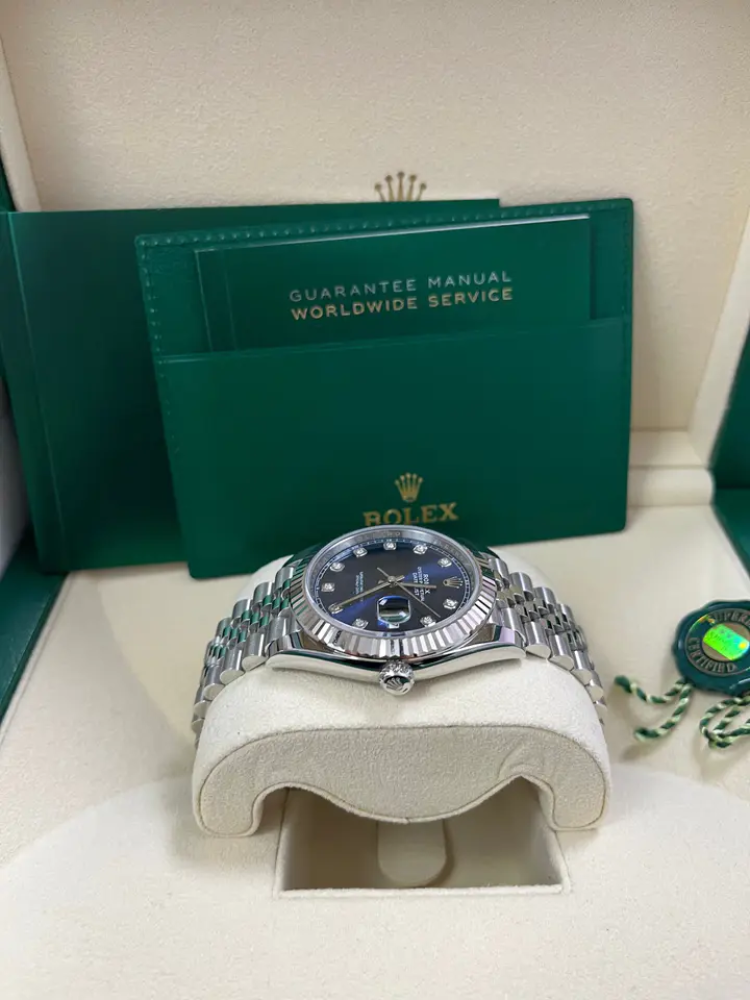 ساعة رولكس ديت جست 41 من الذهب الأبيض والفولاذ، بسوارجوبيلي ذي مينا أزرق مرصع بالألماس. تتميز الساعة بعلبة من الذهب الأبيض عيار 18 قيراطًا مصنوعة من ق...