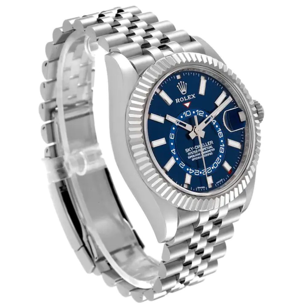 اسم الموديل: ساعة رولكس سكاي دويلر للرجال، مينا أزرق، سوار جوبيلي من الفولاذ، رقم الموديل 326934، مع العلبة والبطاقة.