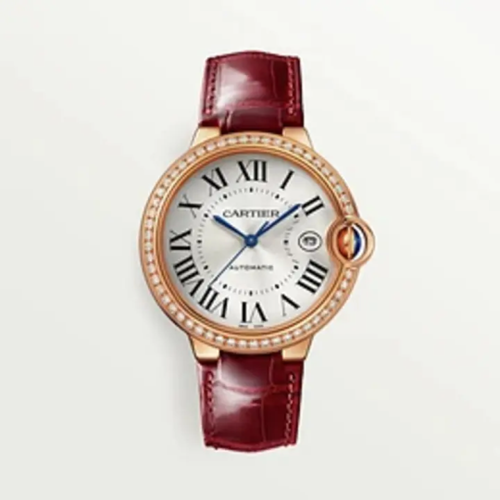 ساعة بالون بلو دو كارتييه، قطرها 36 مم، حركة ميكانيكية ذاتية التعبئة، عيار 1847 MC. علبة من الذهب الوردي عيار 750/1000 مرصعة بـ 52 ماسة بقطع بريلينت ب...